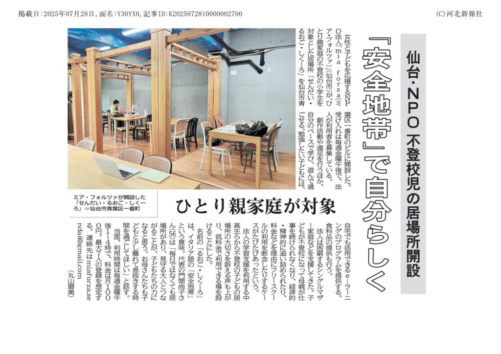 ひとり親家庭の小学生向け、平日日中のこどもの居場所「せんだい・るおご・しくーろ」の取り組みを、7月28日の河北新報さんに掲載していただきました!
