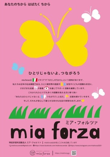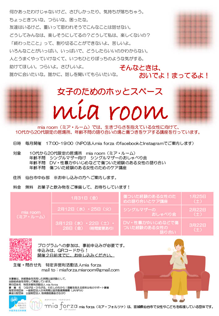 「mia room(ミア・ルーム)」では、生きづらさを抱えている女性に向けて10代~20代限定の居場所、年齢不問の語り合いの場と傷つきをケアする講座を行なっています。