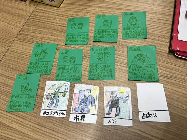 お友達が作ってくれた、オリジナル人狼カードで遊んだり、絵しりとりに挑戦してみたり、ひとりひとりが輝いている瞬間でした。それぞれがおもしろく、良い色を出しているような。新年度になって、子どもたちのこんな一面もあったんだという嬉しい発見にもなりました。