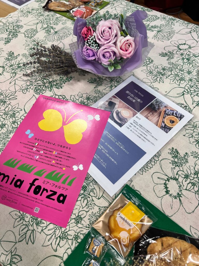 テーブルにはお菓子とお茶、アドバイザーの家で育てたドライフラワーのラベンダー。ちょっとした彩りが場をやさしく包みます。