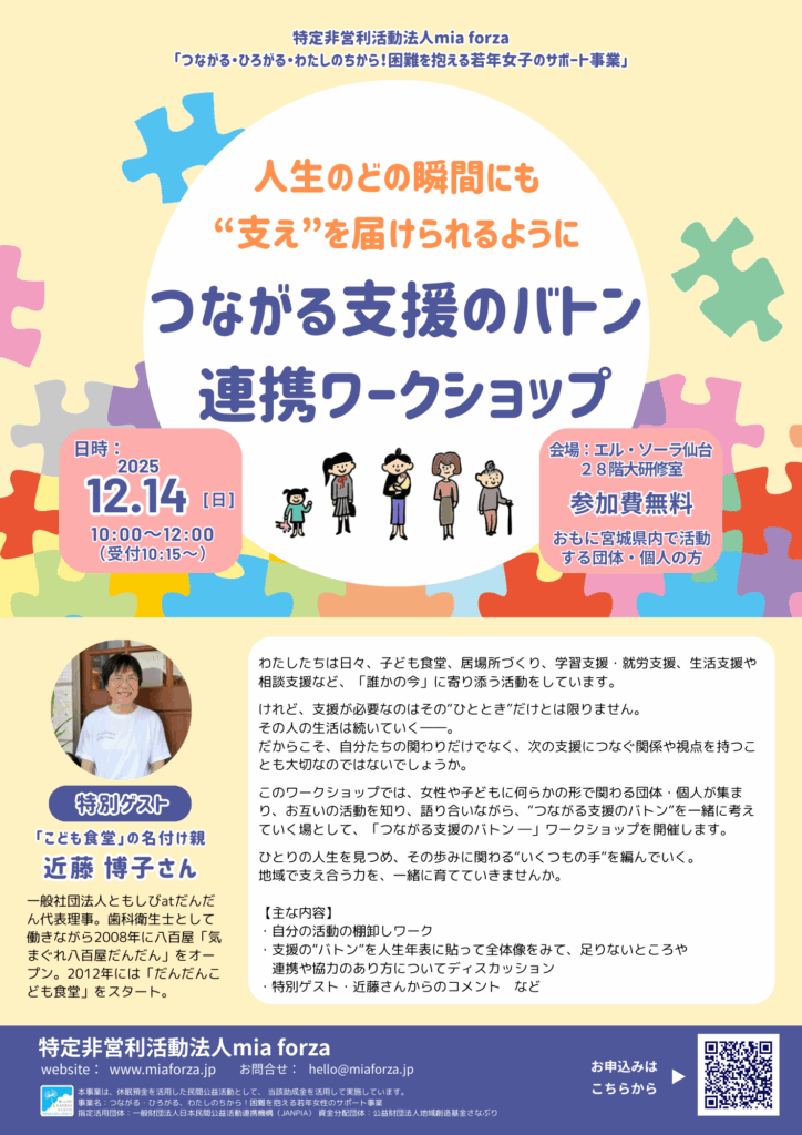 このワークショップでは、女性や子どもに何らかの形で関わる団体・個人が集まり、お互いの活動を知り、語り合いながら、“つながる支援のバトン”を一緒に考えていきます。